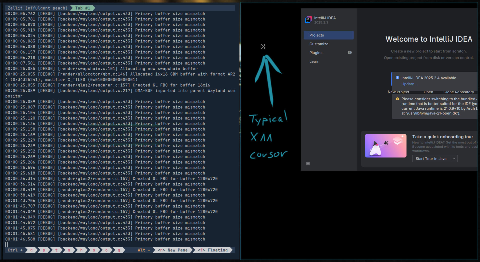 Luckily, an idea to fix this issue popped into my head, eventually. Out of the sudden I remembered the video about Wayback by Brodie Robertson and this made me wondering if Wayback can deal also with single application windows that are based on X11, such as OpenJDK 21 applications and in this case more specific IntelliJ. The usage documentation looked promising: